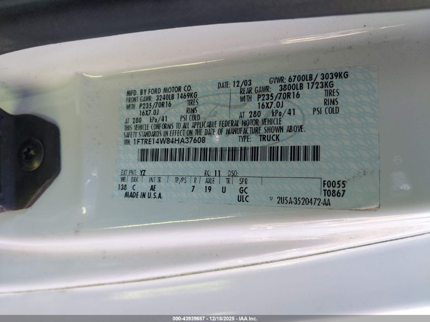 - Vin: 1FTRE14W84HA37608