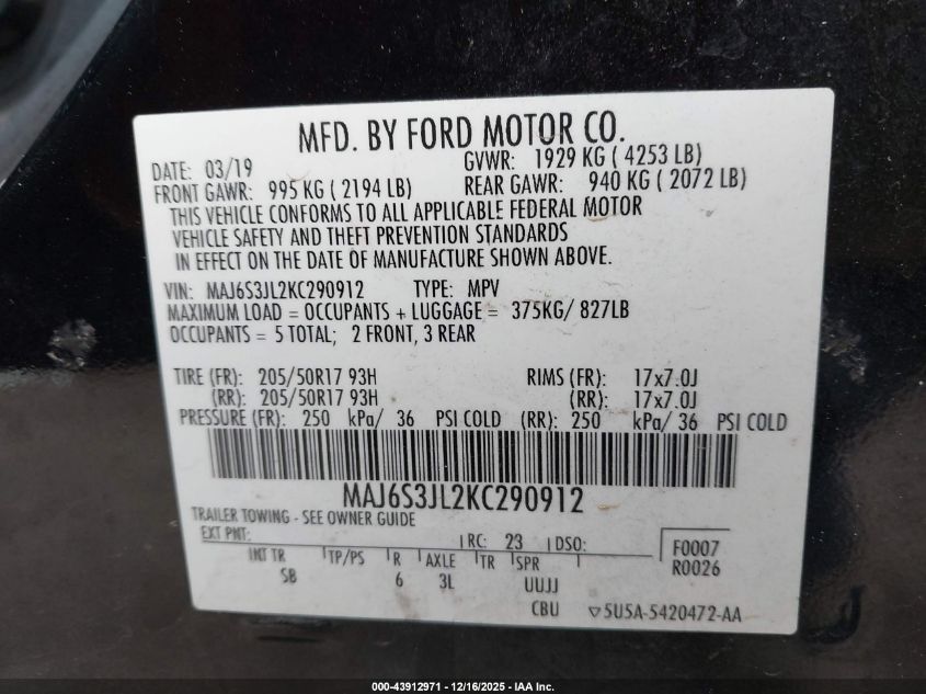 - Vin: MAJ6S3JL2KC290912