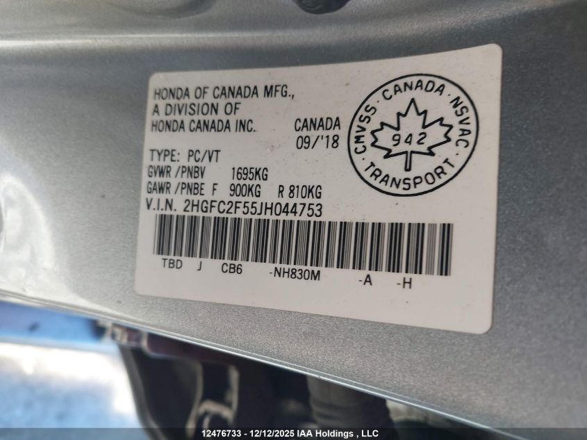 - Vin: 2HGFC2F55JH044753