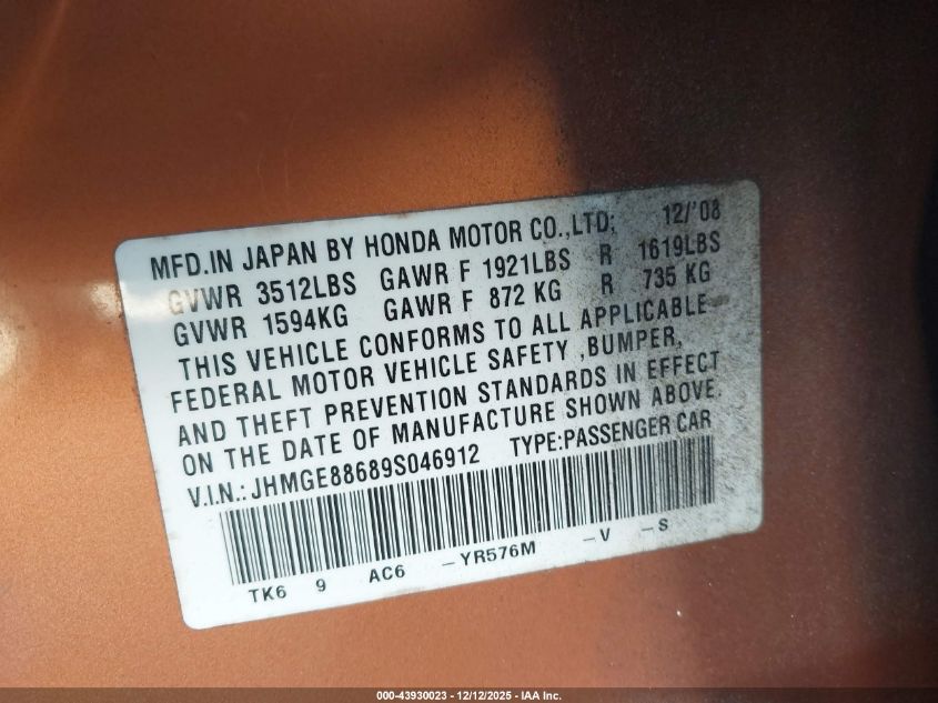 - Vin: JHMGE88689S046912