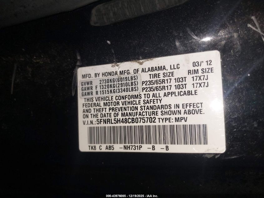 - Vin: 5FNRL5H48CB075702