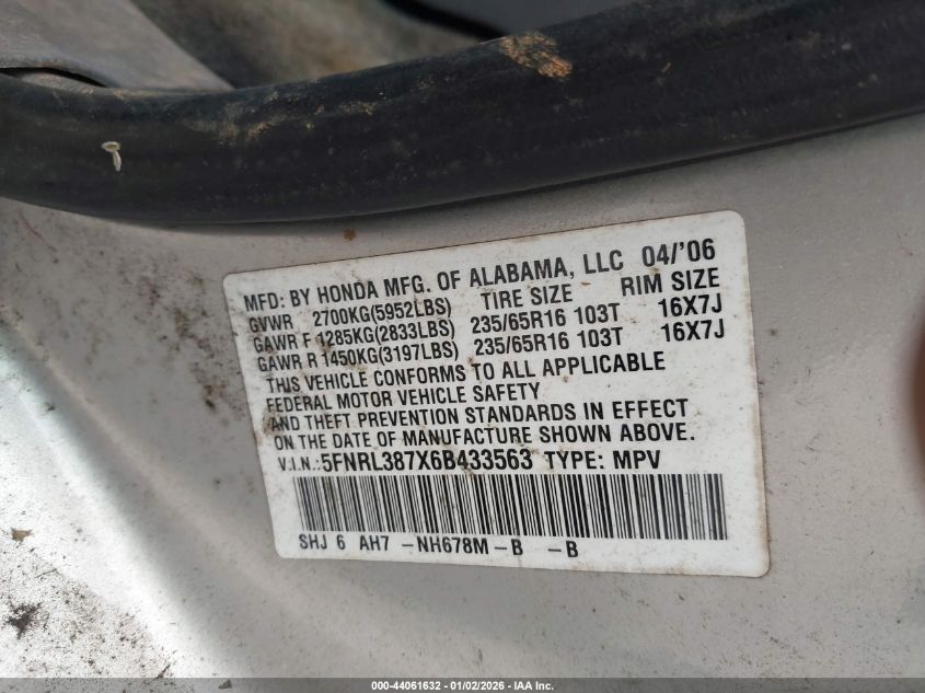 - Vin: 5FNRL387X6B433563