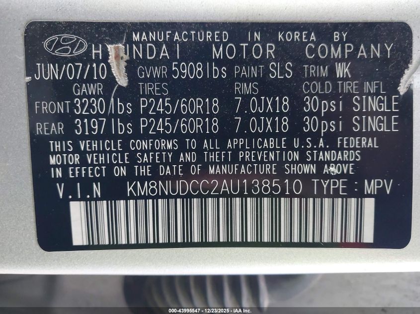 - Vin: KM8NUDCC2AU138510
