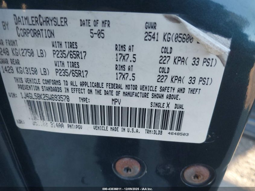 - Vin: 1J4GL58K25W693578