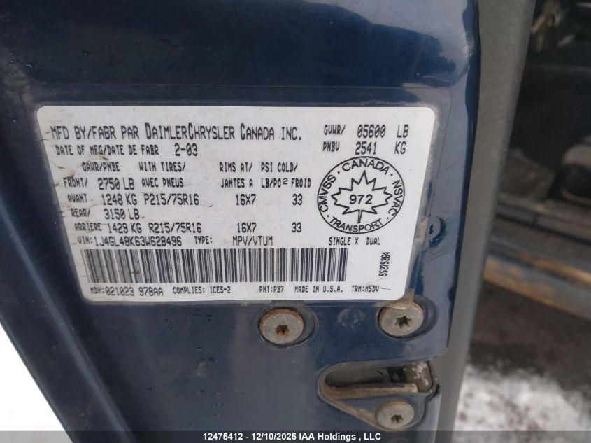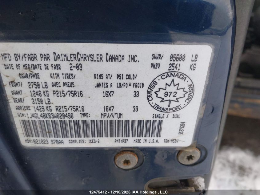 - Vin: 1J4GL48K63W628496