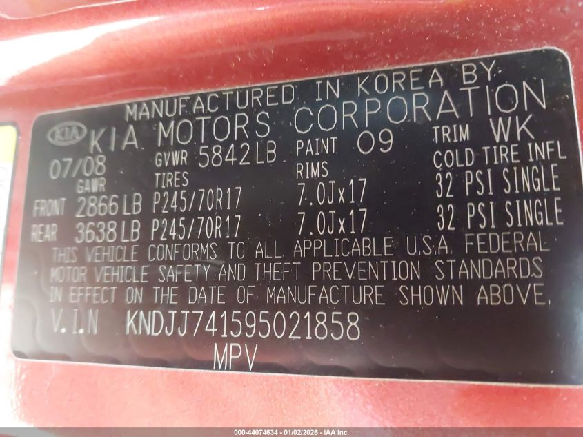 - Vin: KNDJJ741X95025646