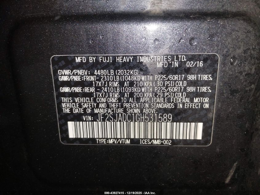 - Vin: JF2SJAFC0GH476033