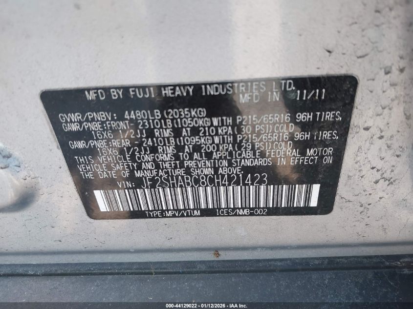 - Vin: JF2SHABC8CH421423