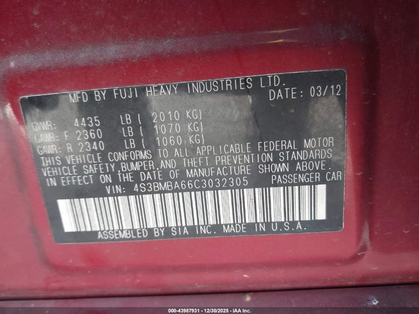 - Vin: 4S3BMBA66C3032305